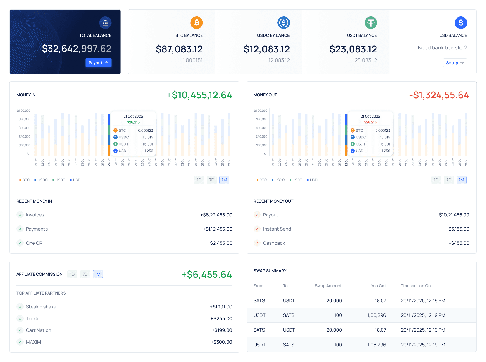 Convert fiat to crypto and crypto to fiat seamlessly. Full KYB/AML compliance, instant settlements, and zero-fee
