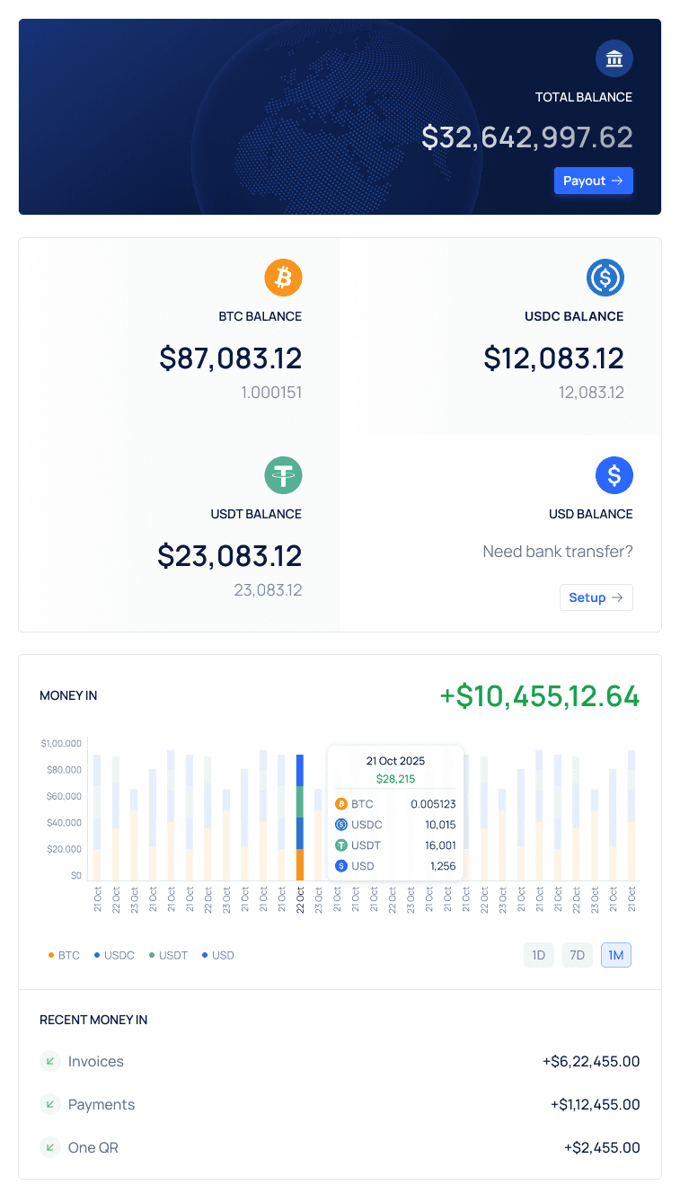 Convert Bitcoin, USDT, and USDC to USD with same-day ACH settlements directly to your business bank account.